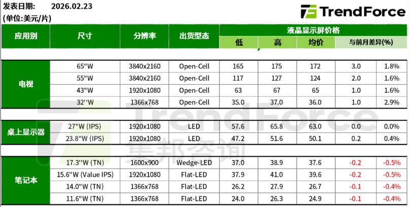 2月23日,TrendForce集邦咨询公布了2月面板价格:2026年2月,电视面板价格上涨,显示器面板部分尺寸价格微幅变动。
