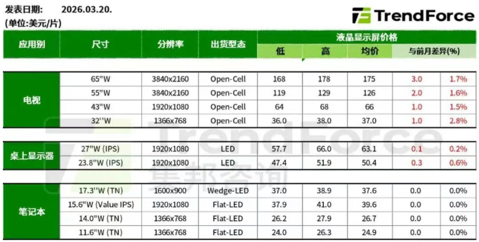 3月20日,集邦公布今年三月下旬面板价格预测,TV品牌进入第二季促销档期,加上因应成本而增加提前备货的意愿,持续维持电视面板价格上涨的态势;3月份的显示器面板价格涨势更有稍扩大迹象;至于NB第二季后面板需求有可能出现修正,面板厂对于坚守面板价格态度转趋强硬,目前预估3月份的NB面板价格将全面下跌转为持平态势。