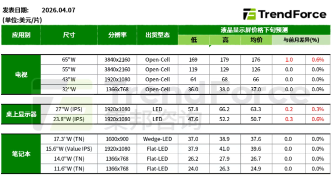 4月7日,TrendForce集邦咨询发布本月面板价格预测。整体来看:4月大尺寸电视面板预期上涨,中尺寸规格价格持稳;显示器面板价格预计将上涨;笔电面板价格预期持平。